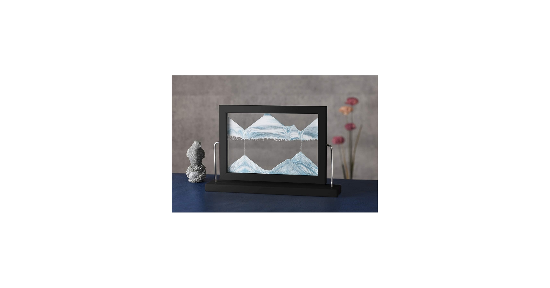 サンドピクチャーとは、2枚のガラス板やアクリル板の間に砂、水、空気などを入れ、フレームを上下逆さまにすることで、砂が落ちて模様を描き出すアートフレームのことです。毎回異なる砂の落ち方で風景や絵画のような情景を作り出し、その変化を楽しむことができます。